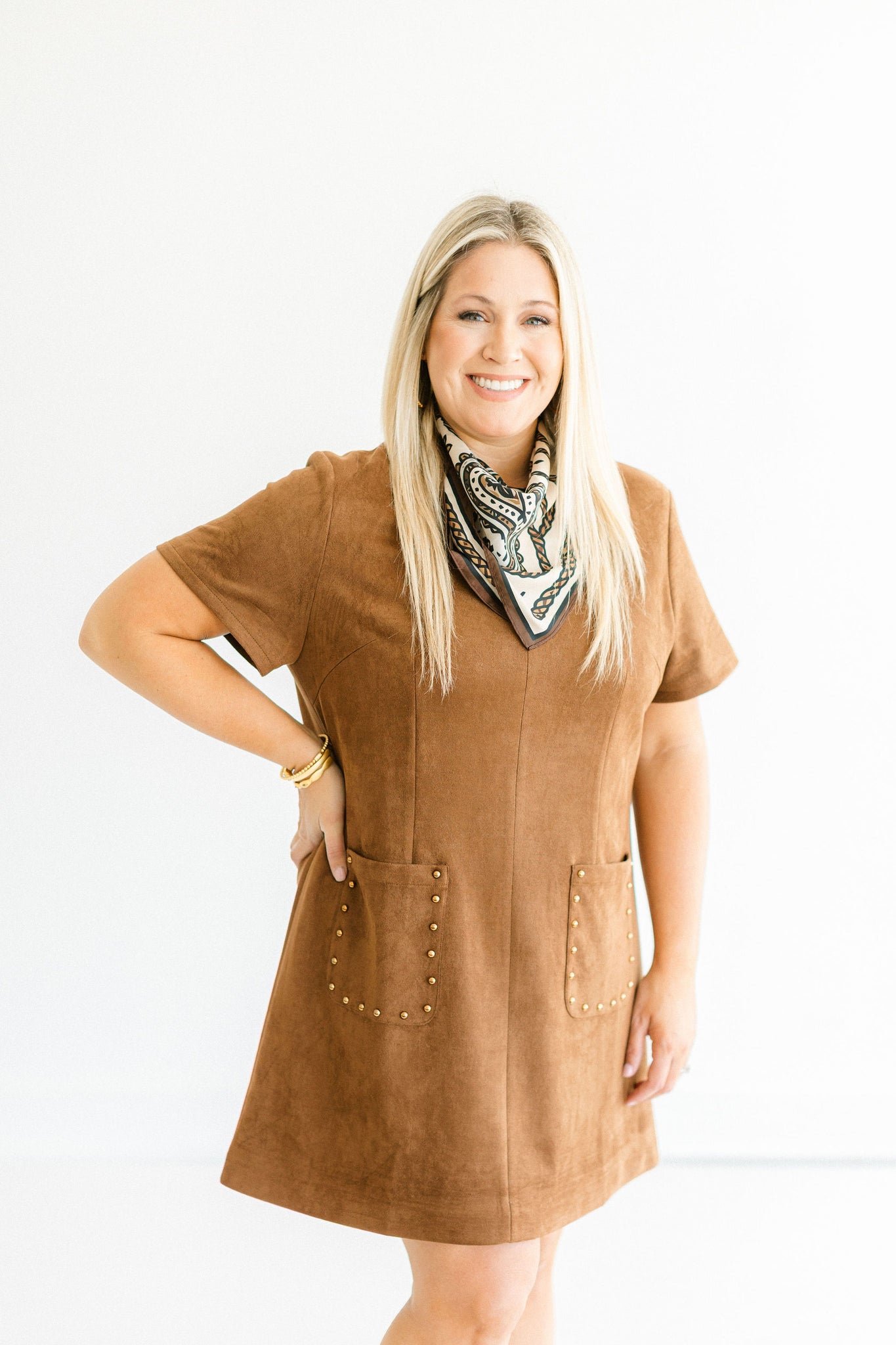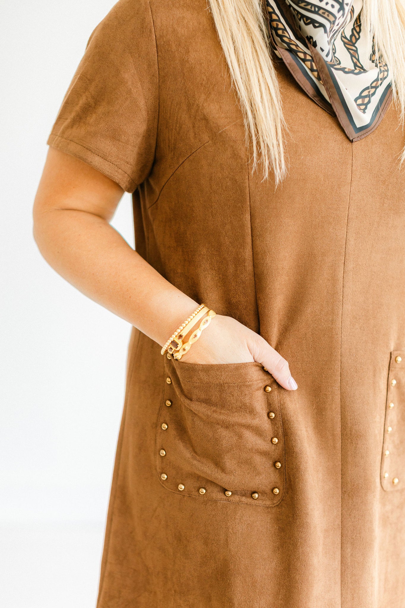 This rich dress is crafted from ultra-soft faux suede for a luxe, velvety feel. The simple silhouette is elevated with studded front pockets that add a touch of edge to its classic charm. Designed with short sleeves and a crew neckline, it’s the perfect transitional piece. Pair it with boots or sneakers for a laid-back look.